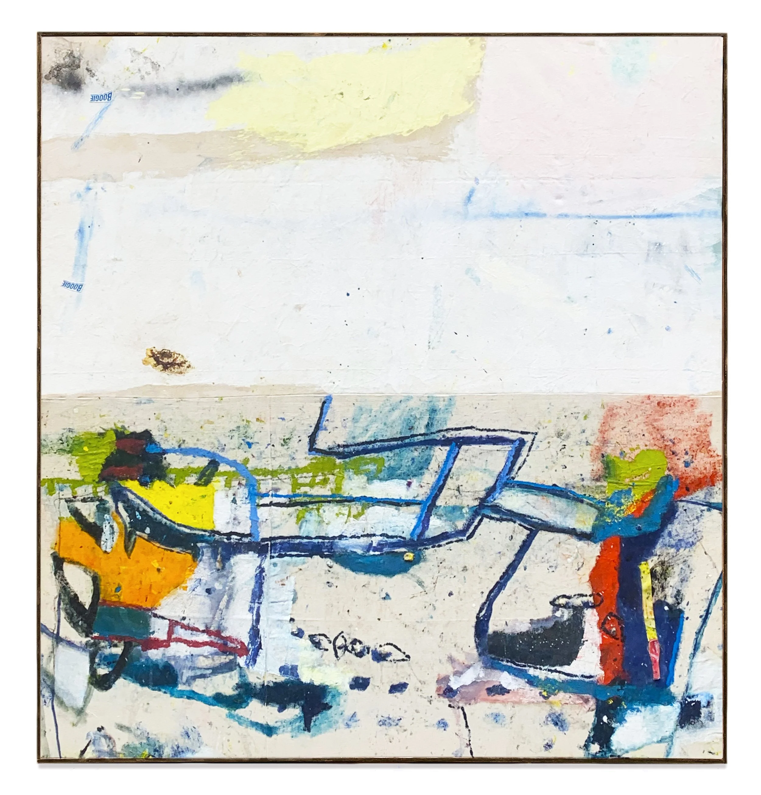 76cm x 163.5cm (in artist’s frame), oil, oil stick, acrylic, earth matter, pen, pencil, stones and found objects on canvases from the Pacific coast of Peru and the Atlantic coast of Cornwall.