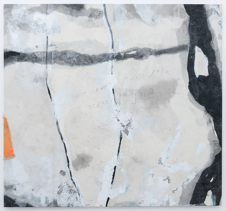 184.5 x 170.6 cm. Chinese ink, oil paint, acrylic paint, enamel paint, pen, sand, earth and found object on canvas.