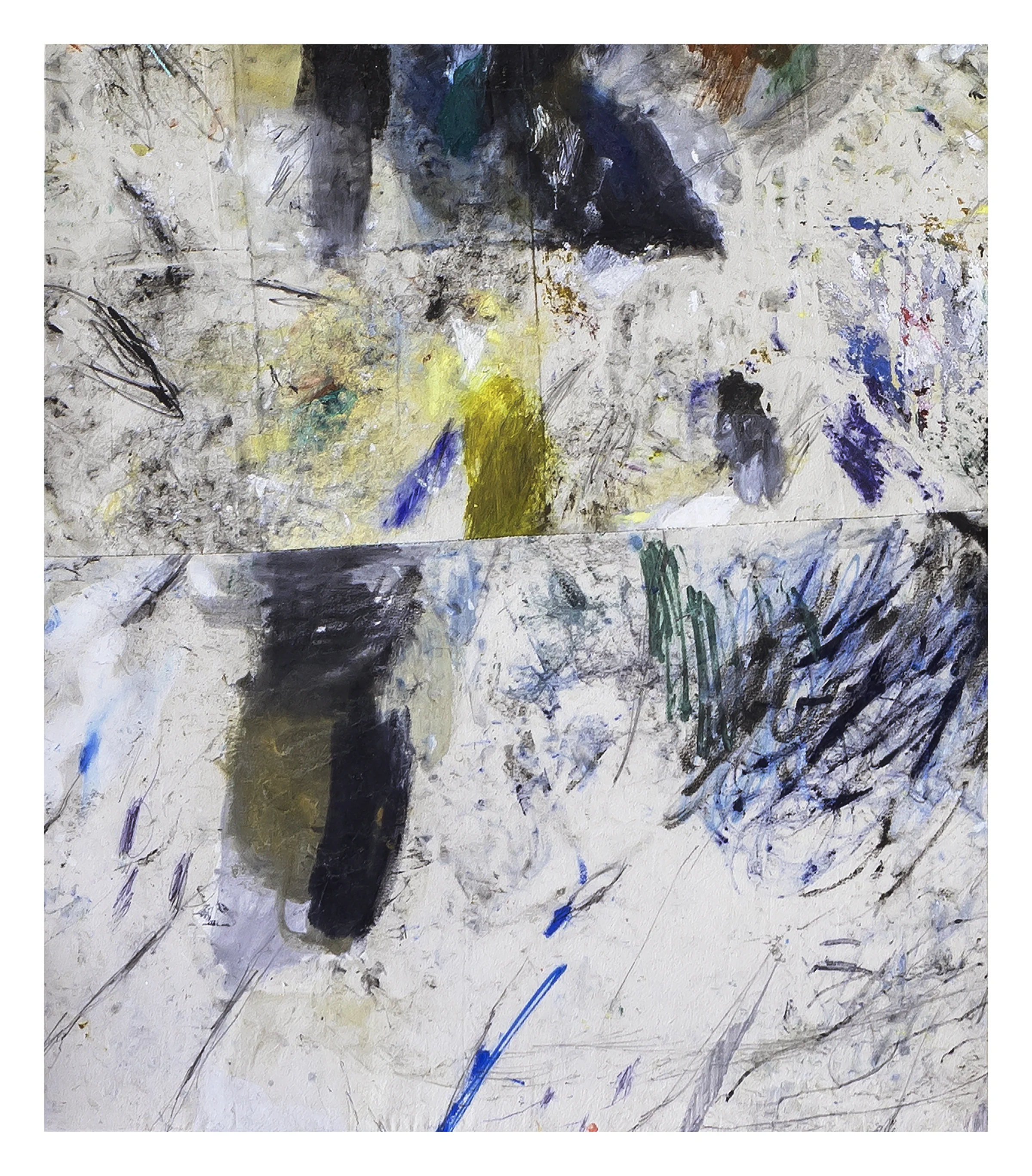 110cm x 126cm. Oil, acrylic, enamel, pencil, oil stick, pen, earth, found objects and thread on canvases from the Pacific and Atlantic Oceans.