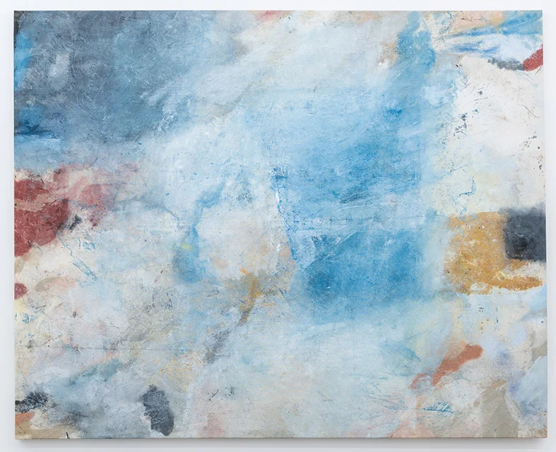 198.3 x 169 cm. Oil paint, acrylic paint, enamel paint, oil stick, pencil, earth and cuttlefish bone matter and masonry paint on canvas.