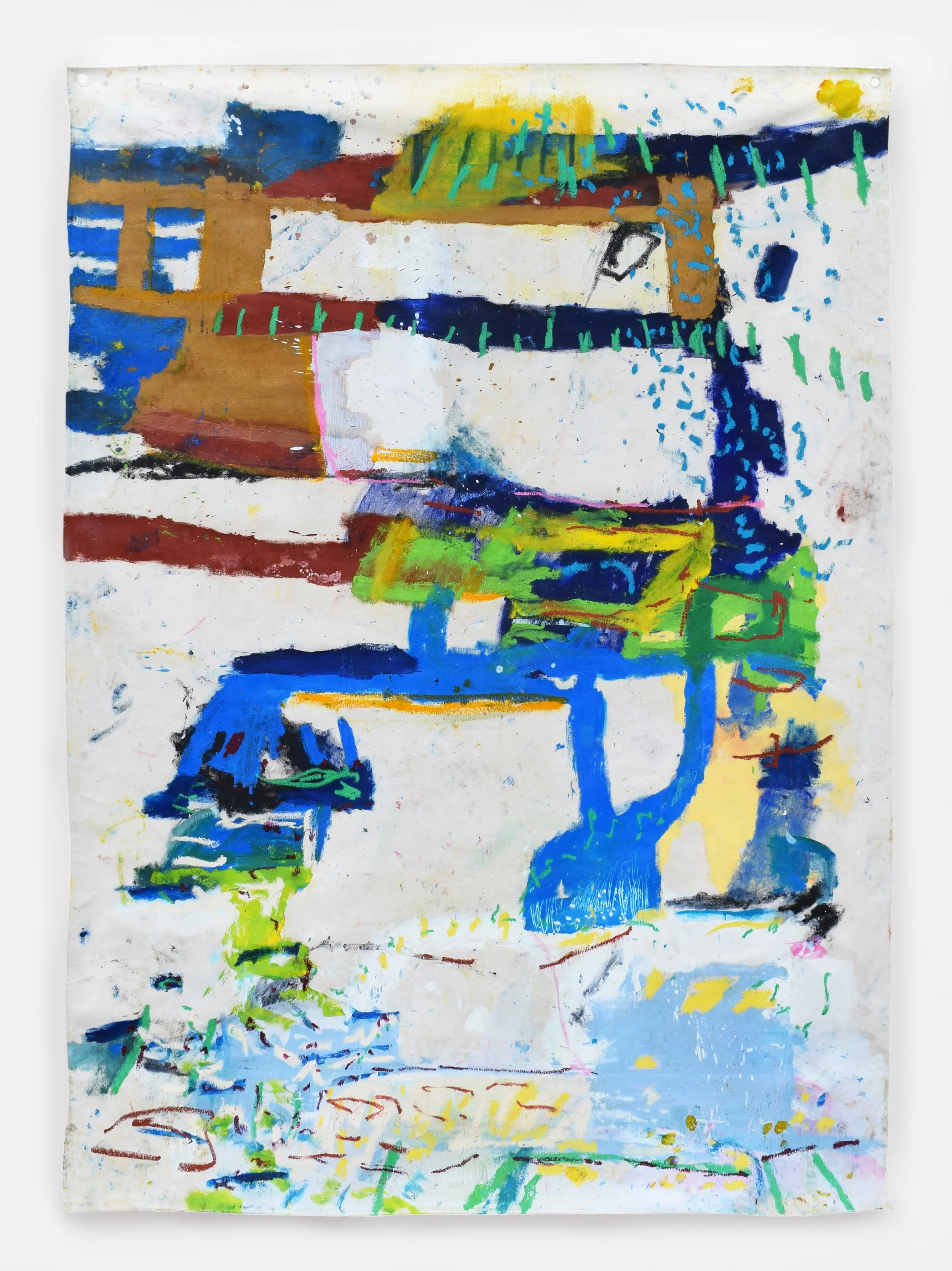 Oil, oil stick, found objects and earth matter on canvas with metal grommets.