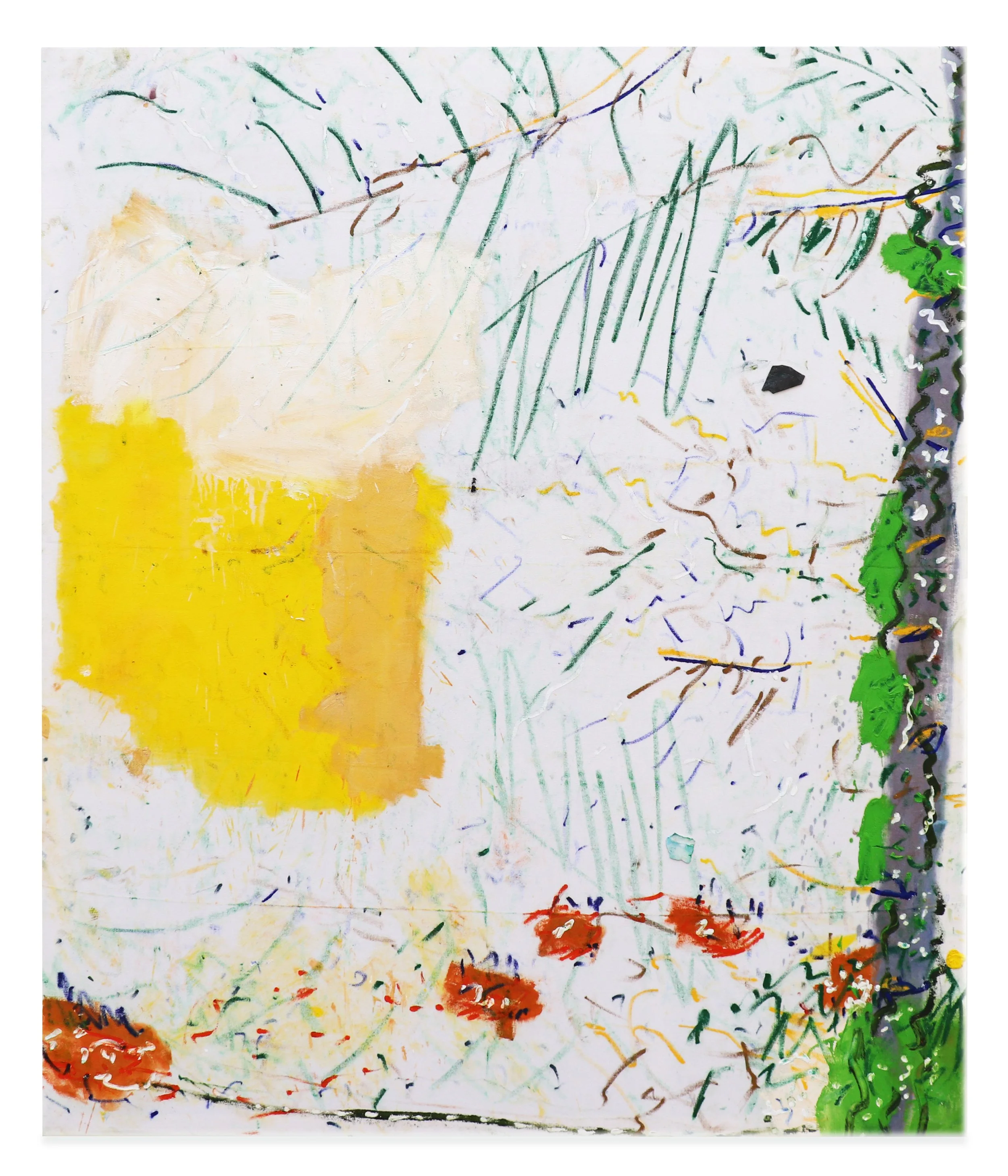 Oil, oil stick, marker pen, sand, dirt and found objects on canvas.