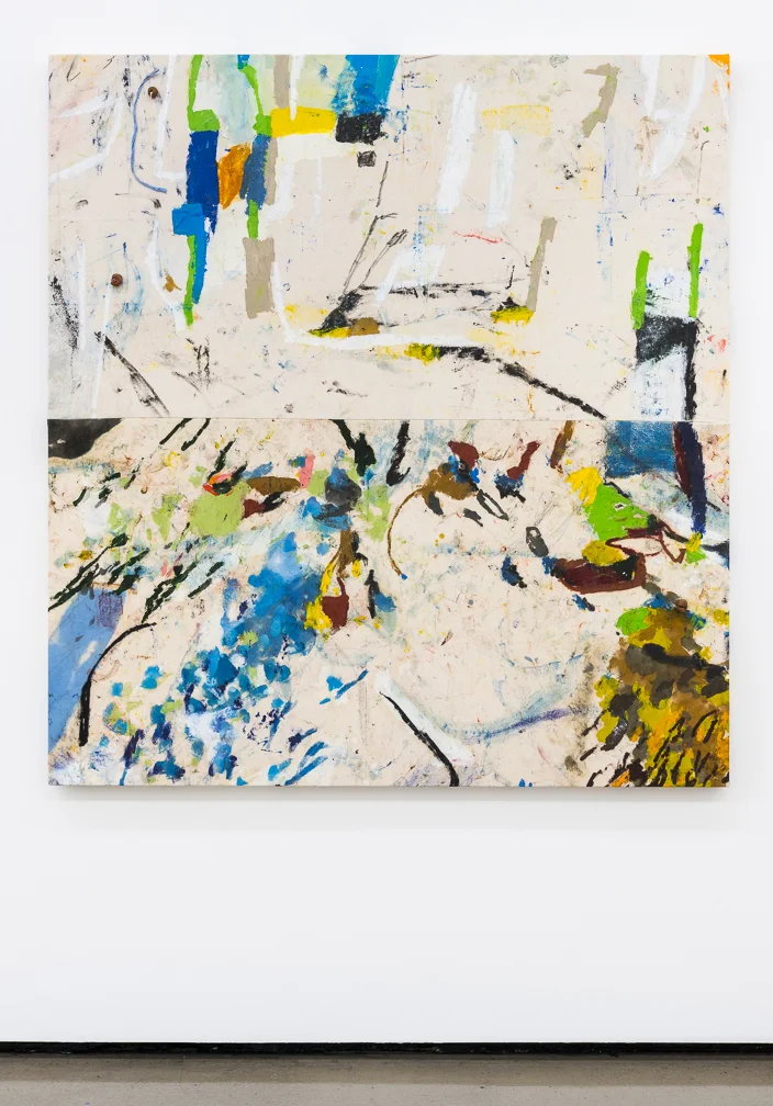 141 x 129. Oil, acrylic, enamel, pencil, oil stick, pen, earth, clay, found objects and thread on canvases from the Pacific coast of Baja California Sur, Mexico and the Atlantic coast of Cornwall, England.