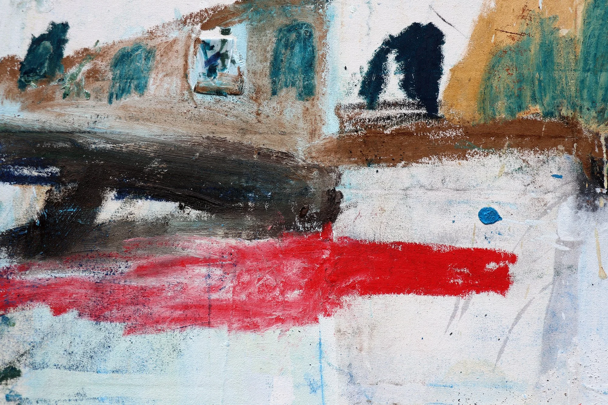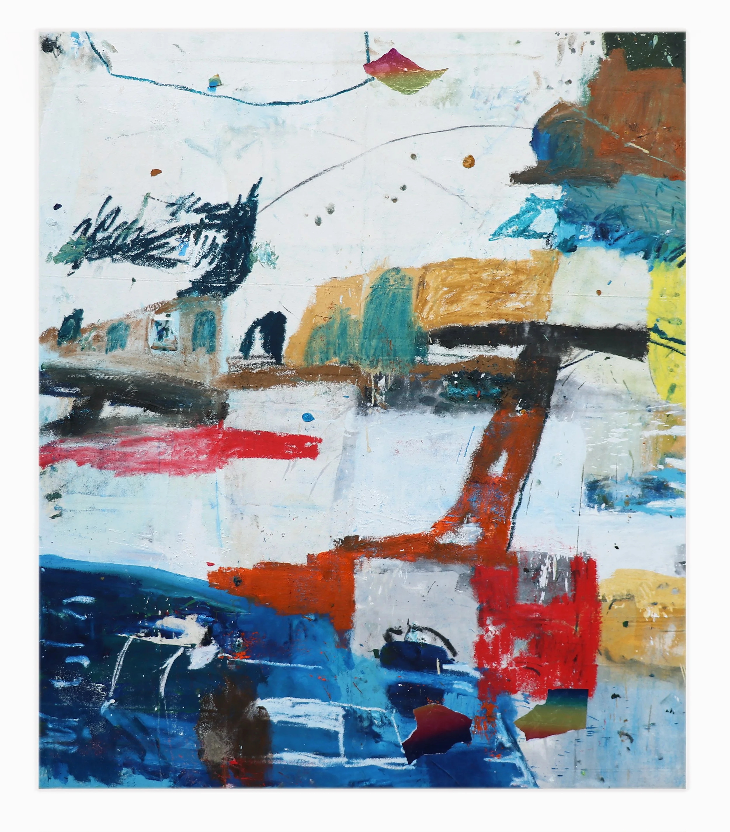 Oil, oil bar, earth matter, found objects, found paper from outside a KFC in Leicester, England and sand from Venice Beach, California on canvas from the Pacific coast of Hokkaido, Japan and Hainan, China
